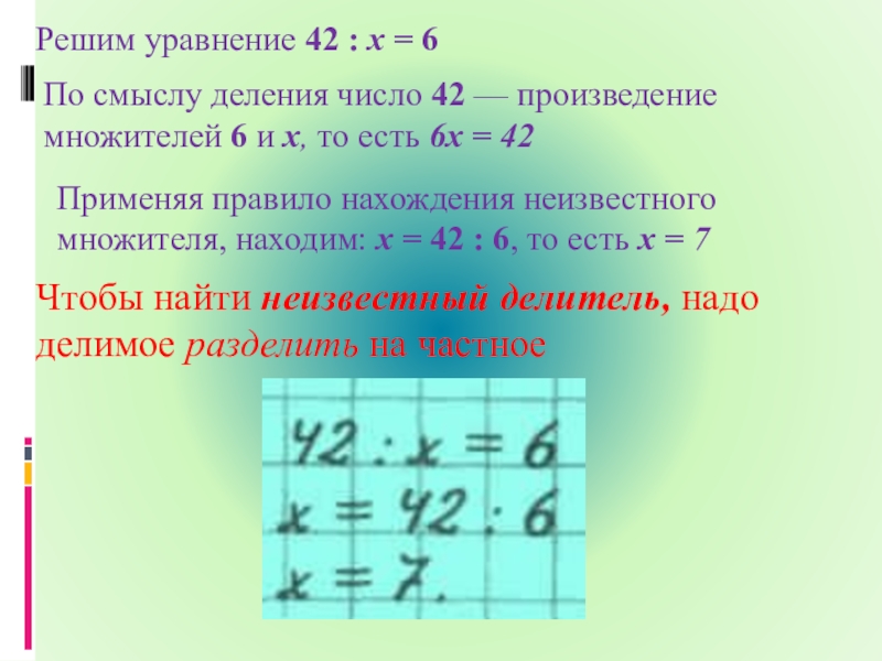 По смыслу деления число 42 — произведение множителей 6 и х, то есть 6х = 42