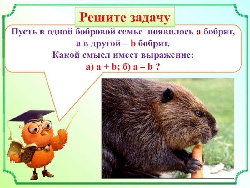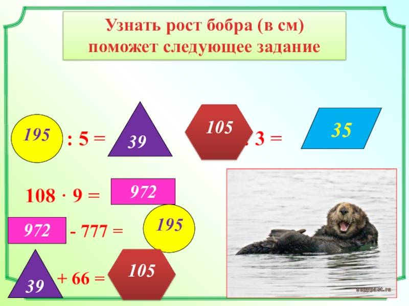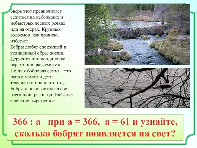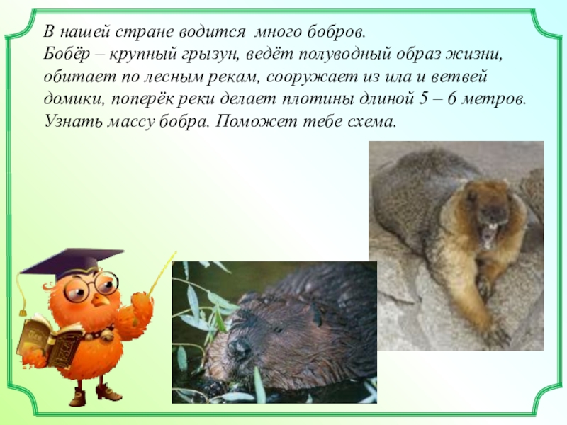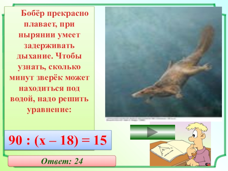 Бобёр прекрасно плавает, при нырянии умеет задерживать дыхание. Чтобы узнать, сколько минут зверёк может находиться под водой, надо решить уравнение: