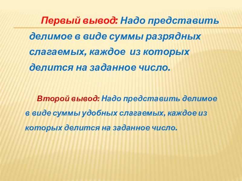 Второй вывод: Надо представить делимое в виде суммы удобных слагаемых, каждое из которых делится на заданное число.
