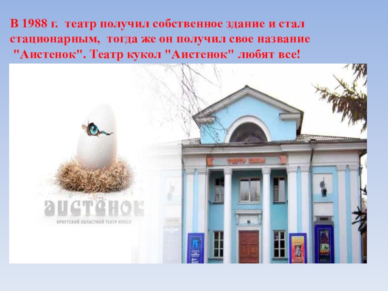 Слайд 18В 1988 г. театр получил собственное здание и стал стационарным, тогда