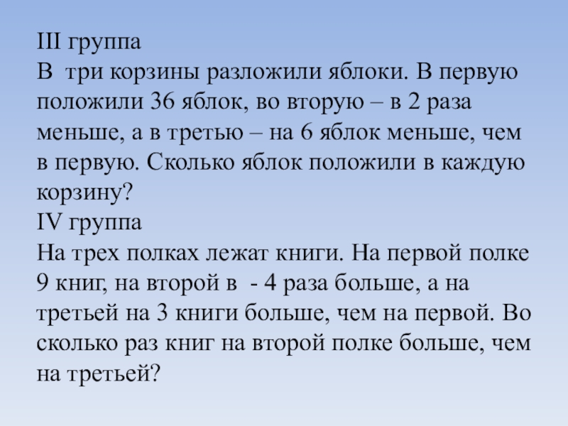 во вторую – в 2 раза меньше, а в третью – на 6 яблок меньше, чем в первую. Сколько яблок положили в каждую корзину?