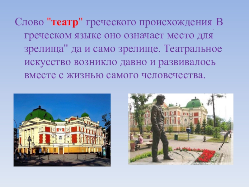 Слайд 5Слово "театр" греческого происхождения. В греческом языке оно означает место для зрелища"
