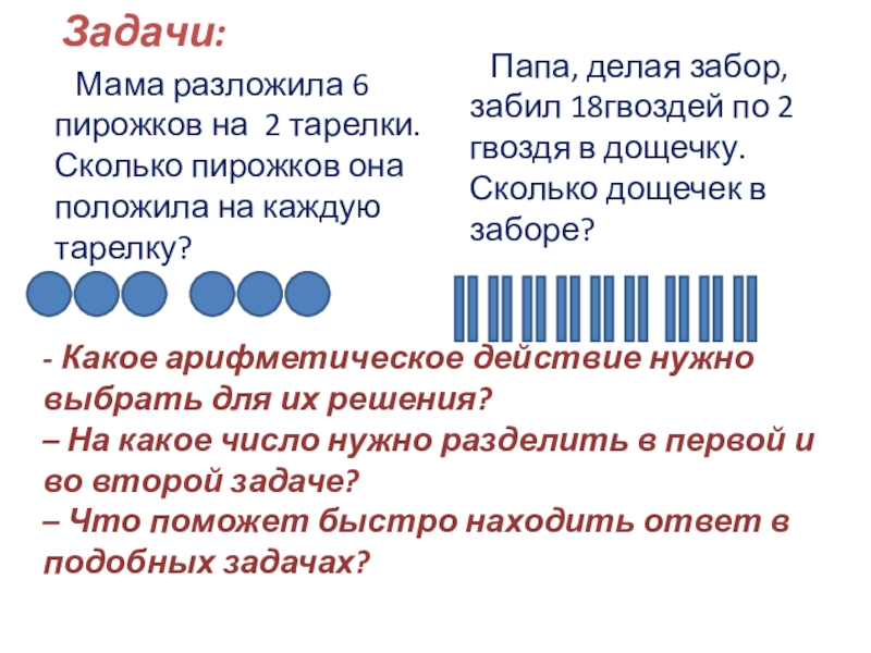 Мама разложила 6 пирожков на 2 тарелки. Сколько пирожков она положила на каждую тарелку?