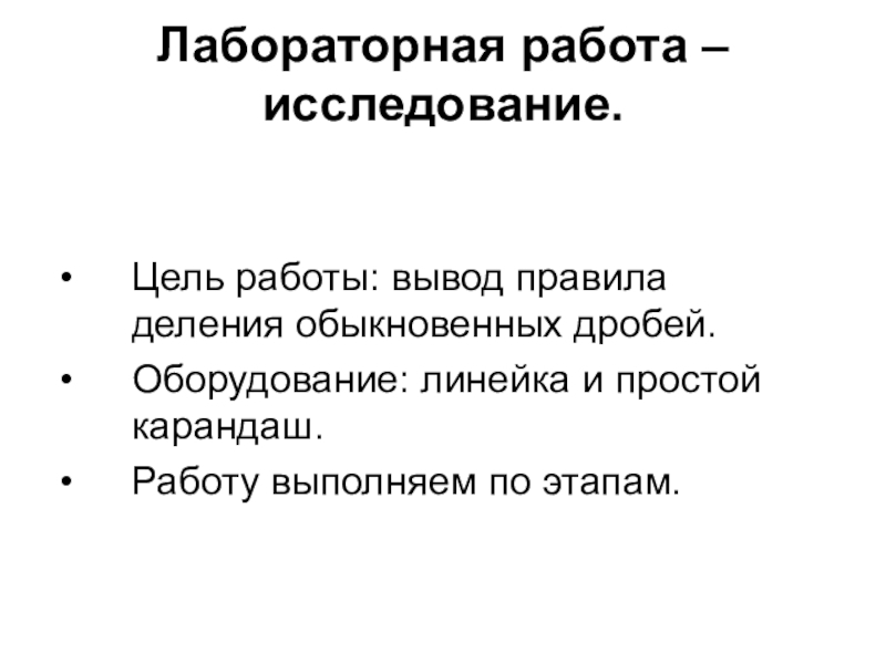 Лабораторная работа – исследование. Цель работы: вывод правила деления обыкновенных дробей.Оборудование: линейка и простой карандаш.Работу выполняем по
