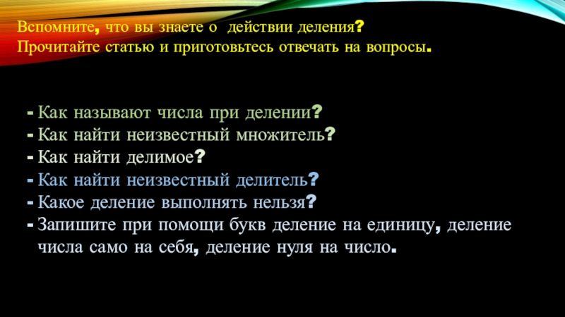 Запишите при помощи букв деление на единицу, деление числа само на себя, деление нуля на число.