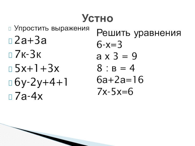 Упростить выражения2а+3а7к-3к5х+1+3х6у-2у+4+17а-4хУстноРешить уравнения6-х=3а х 3 = 98 : в = 46а+2а=167х-5х=6