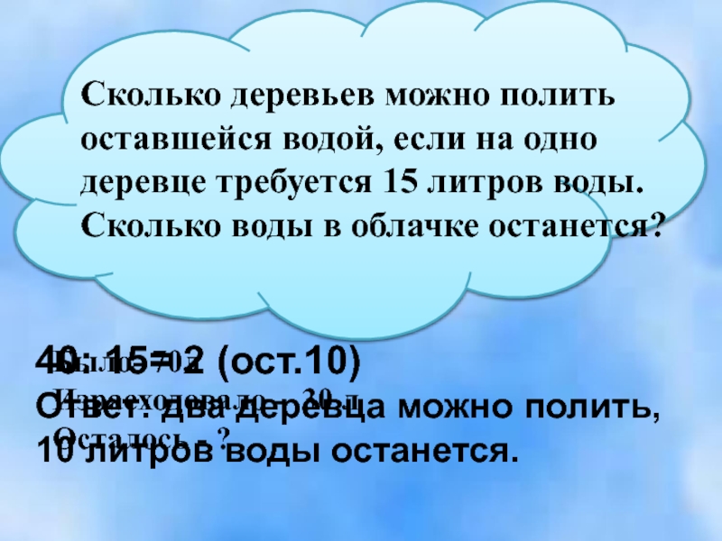 Ответ: два деревца можно полить, 10 литров воды останется.