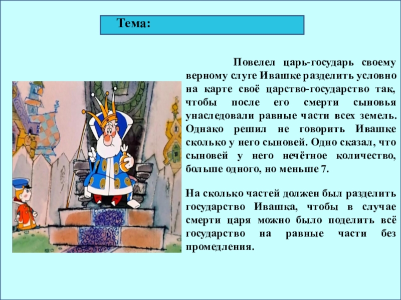 На сколько частей должен был разделить государство Ивашка, чтобы в случае смерти царя можно было поделить всё государство на равные части без промедления.