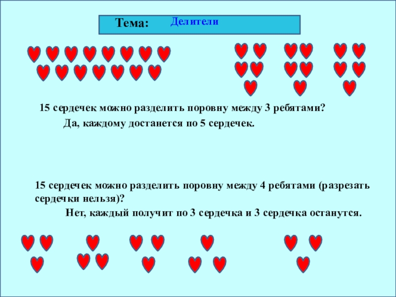 15 сердечек можно разделить поровну между 4 ребятами (разрезать сердечки нельзя)?
