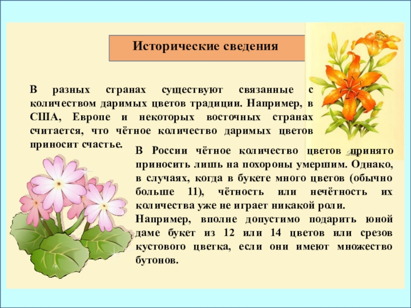 В России чётное количество цветов принято приносить лишь на похороны умершим. Однако, в случаях, когда в букете много цветов (обычно больше 11), чётность или нечётность их количества уже не играет никакой роли.