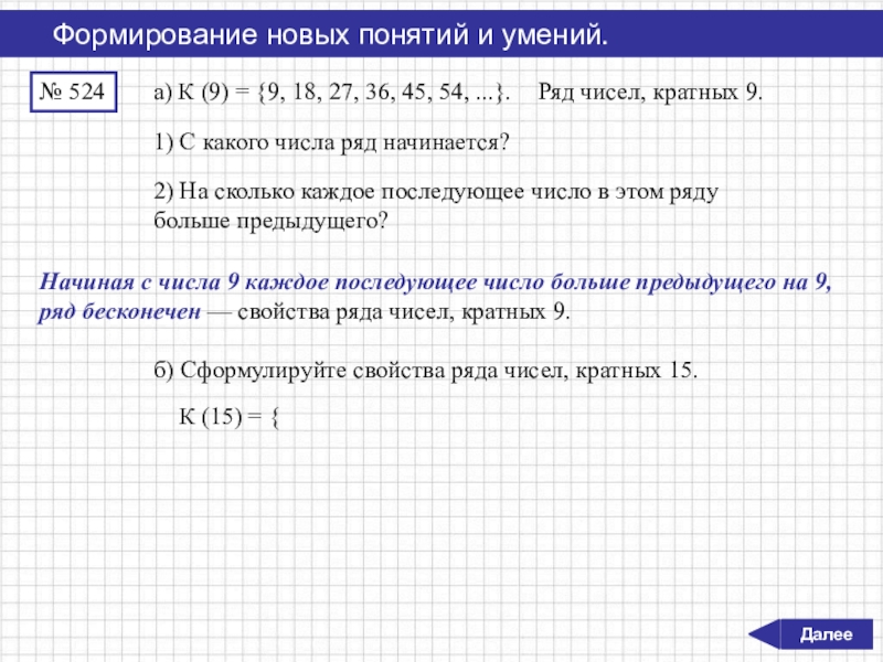 Начиная с числа 9 каждое последующее число больше предыдущего на 9, ряд бесконечен — свойства ряда чисел, кратных 9.