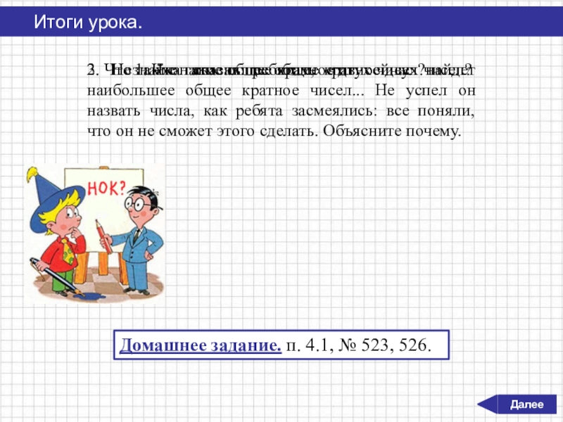 3. Незнайка сказал ребятам, что сейчас найдет наибольшее общее кратное чисел... Не успел он назвать числа, как ребята засмеялись: все поняли, что он не сможет этого сделать. Объясните почему.