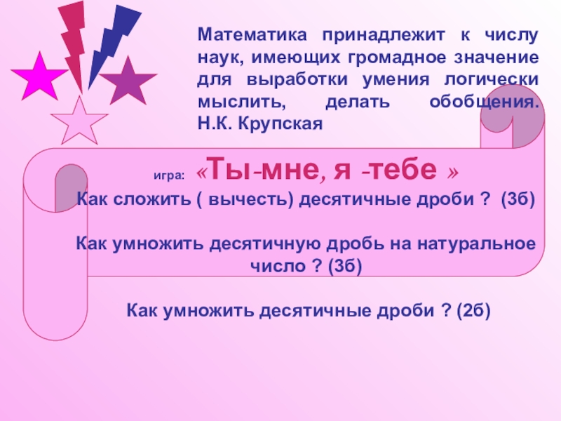 Математика принадлежит к числу наук, имеющих громадное значение для выработки умения логически мыслить, делать обобщения. Н.К. Крупская