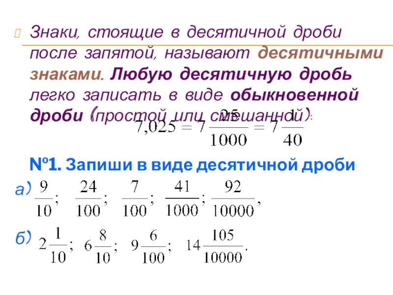 записи дробей со знаменателями 10, 100, 1000 и т д. А «старые», привычные дроби для