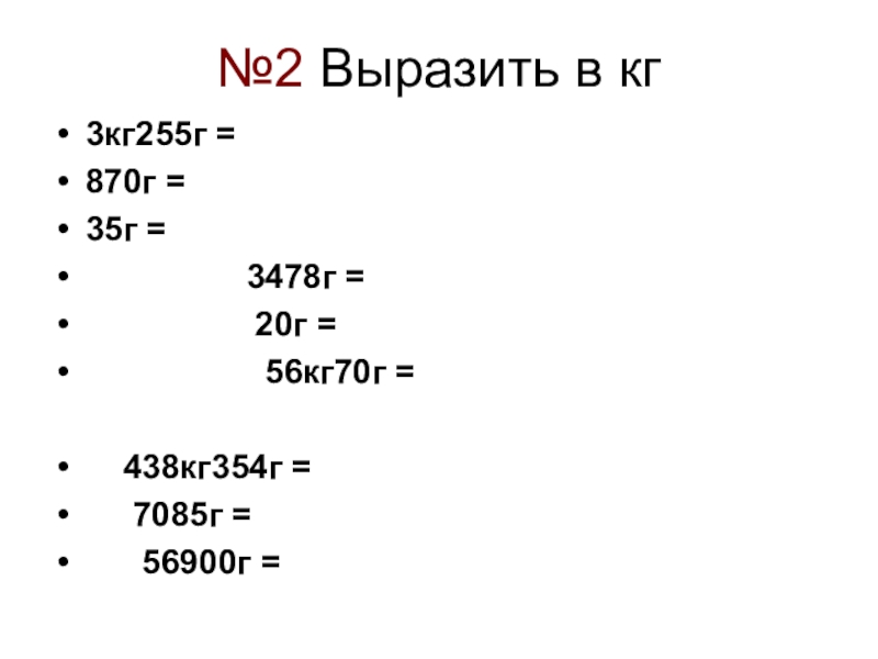 №2 Выразить в кг3кг255г =870г =35г =         3478г =