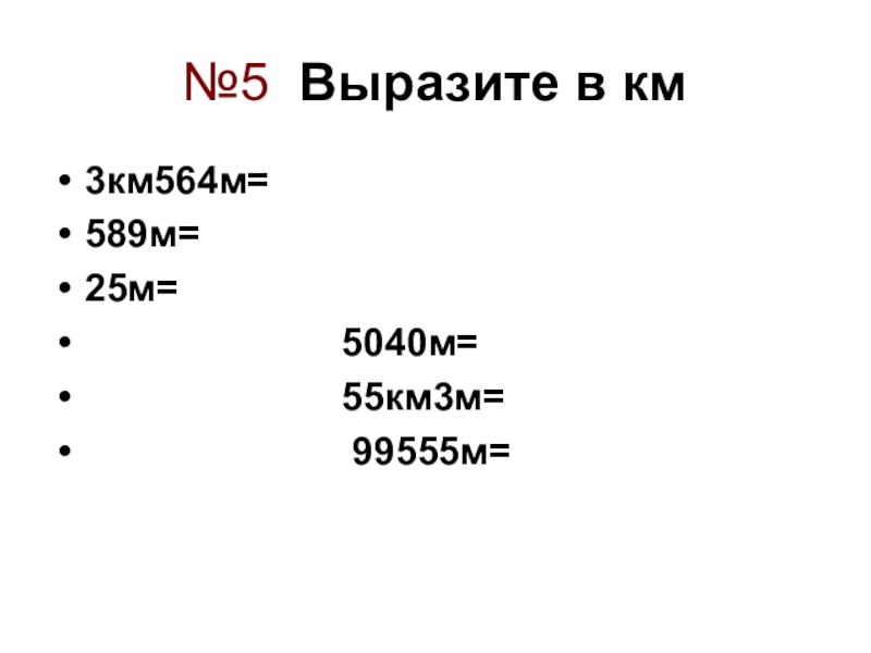 №5 Выразите в км3км564м=589м=25м=            5040м=