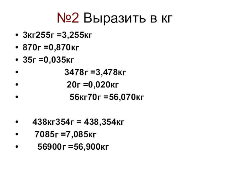 №2 Выразить в кг3кг255г =3,255кг870г =0,870кг35г =0,035кг         3478г =3,478кг