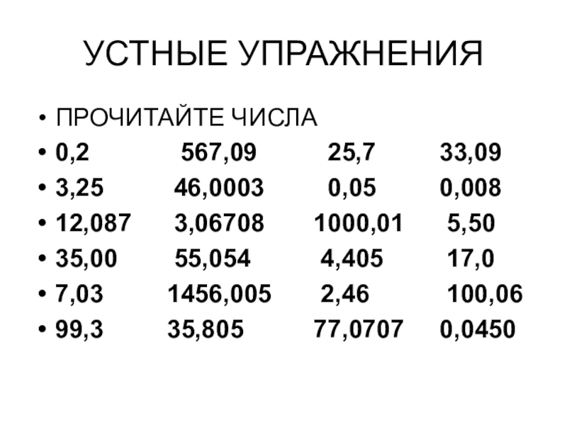 УСТНЫЕ УПРАЖНЕНИЯПРОЧИТАЙТЕ ЧИСЛА0,2 567,09 25,7 33,093,25 46,0003 0,05 0,00812,087