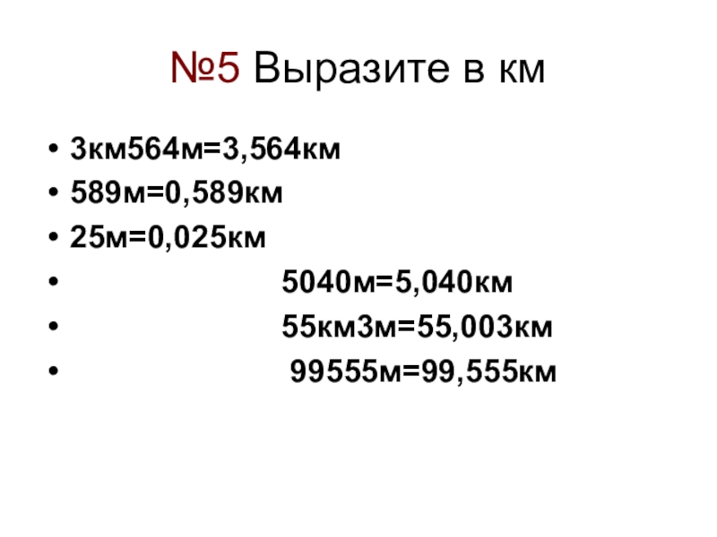 №5 Выразите в км3км564м=3,564км589м=0,589км25м=0,025км            5040м=5,040км