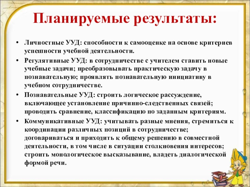 Планируемые результаты:  Личностные УУД: способности к самооценке на основе критериев успешности учебной деятельности. Регулятивные УУД: