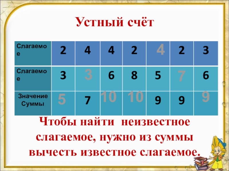 Устный счёт531010479Чтобы найти неизвестное слагаемое, нужно из суммы вычесть известное слагаемое.