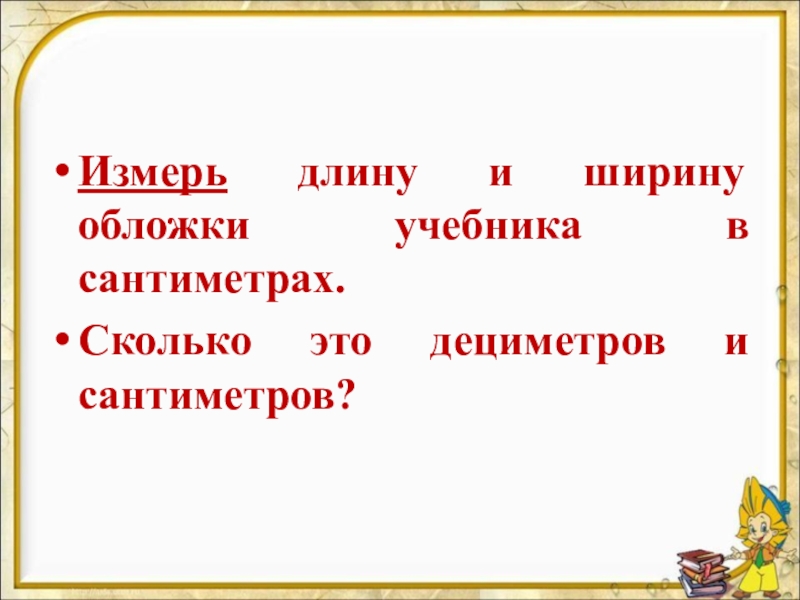Измерь длину и ширину обложки учебника в сантиметрах. Сколько это дециметров и сантиметров?