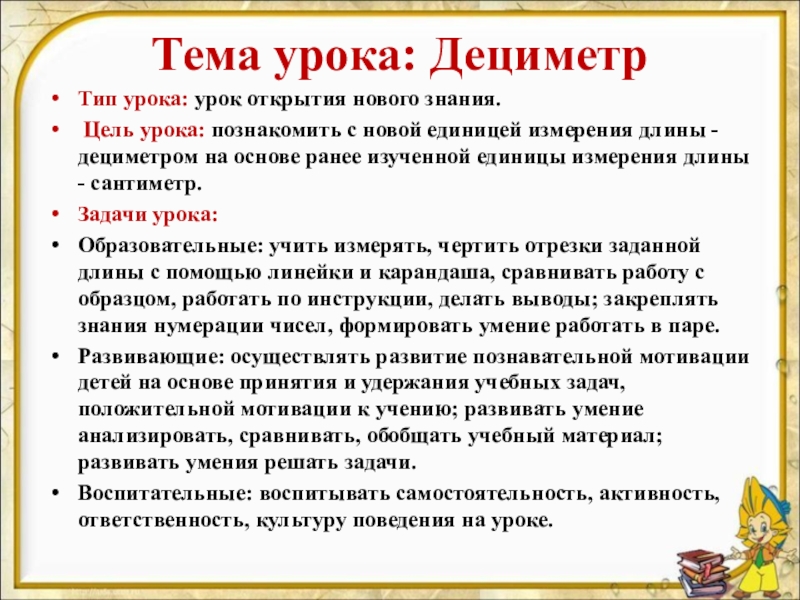 Тема урока: ДециметрТип урока: урок открытия нового знания. Цель урока: познакомить с новой единицей измерения длины - дециметром на основе ранее изученной единицы измерения длины - сантиметр. Задачи урока: Образовательные: учить измерять, чертить отрезки заданной