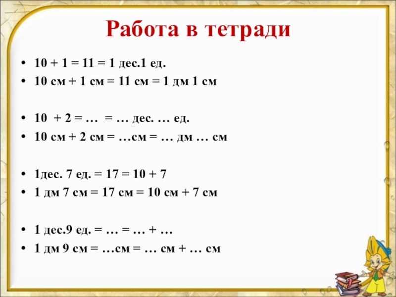 Работа в тетради10 + 1 = 11 = 1 дес.1 ед.10 см + 1 см = 11