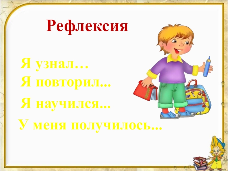 РефлексияЯ узнал…Я повторил...Я научился...У меня получилось...