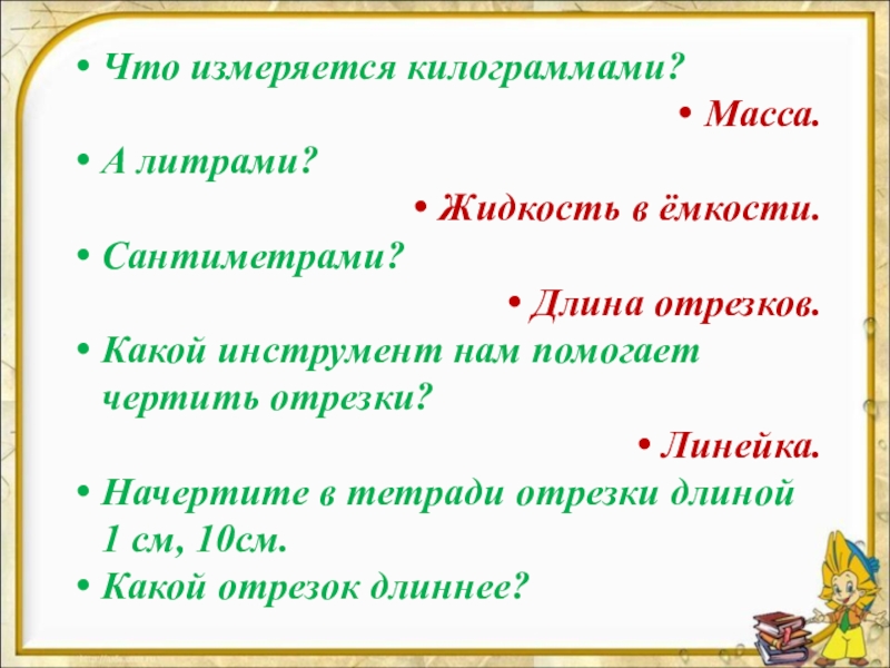Что измеряется килограммами?Масса.А литрами?Жидкость в ёмкости.Сантиметрами?Длина отрезков.Какой инструмент нам помогает чертить отрезки?Линейка.Начертите в тетради отрезки длиной 1