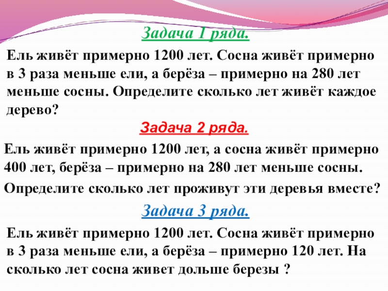 Ель живёт примерно 1200 лет, а сосна живёт примерно 400 лет, берёза – примерно на 280 лет меньше сосны.
