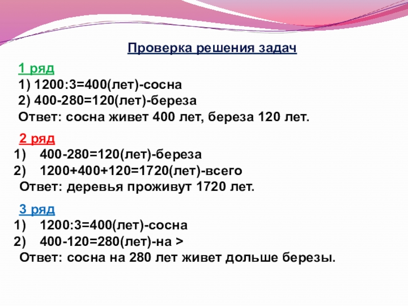 Ель живёт примерно 1200 лет. Сосна живёт примерно в 3 раза меньше ели, а берёза – примерно 120 лет. На сколько лет сосна живет дольше березы ?