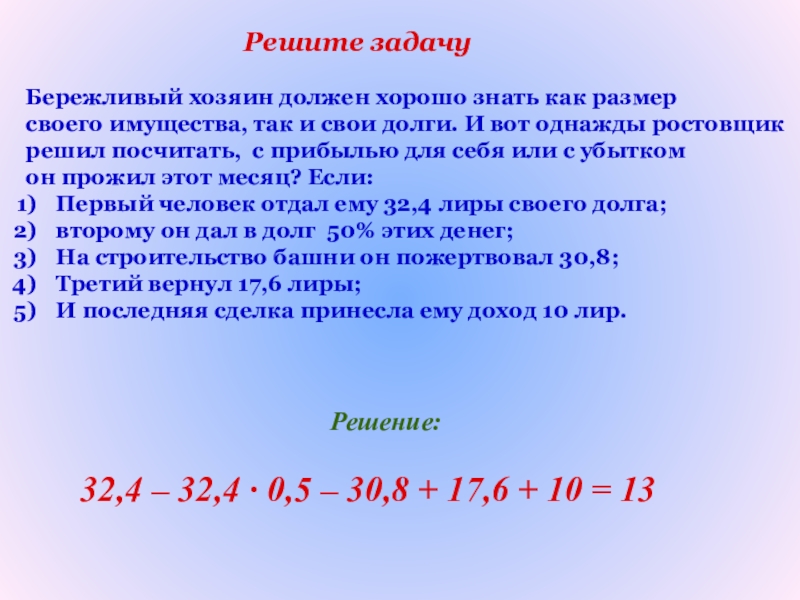 32,4 – 32,4 ∙ 0,5 – 30,8 + 17,6 + 10 = 13