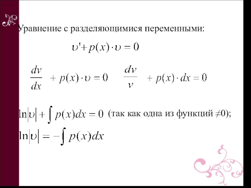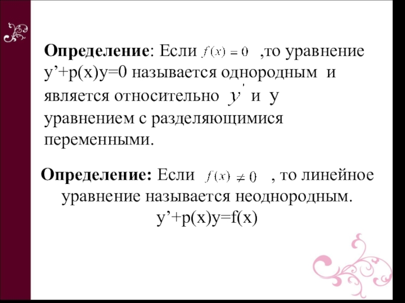 Определение: Если ,то уравнение y’+p(x)y=0 называется однородным и является относительно и y уравнением с разделяющимися