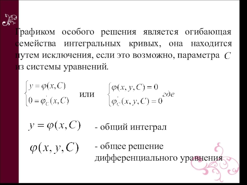 Слайд 31Графиком особого решения является огибающая семейства интегральных кривых, она находится путем