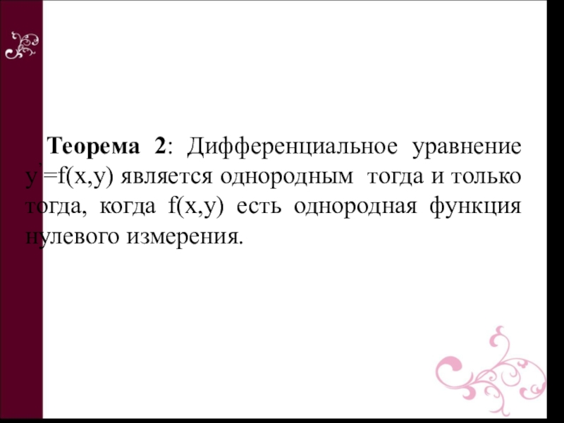 Слайд 27 Теорема 2: Дифференциальное уравнение y’=f(x,y) является однородным тогда и