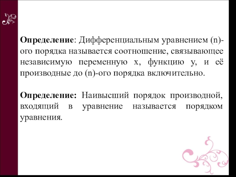 Слайд 2Определение: Дифференциальным уравнением (n)-ого порядка называется соотношение, связывающее независимую переменную х,