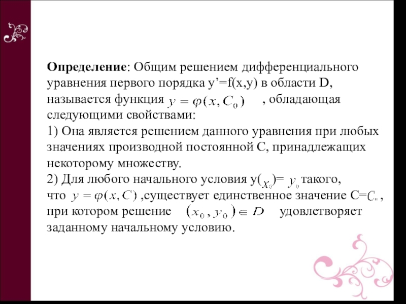 Слайд 7Определение: Общим решением дифференциального уравнения первого порядка y’=f(x,y) в области D,