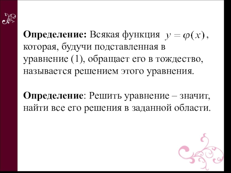 , которая, будучи подставленная в уравнение (1), обращает его в тождество, называется решением этого уравнения.