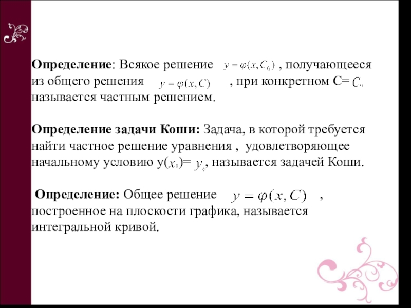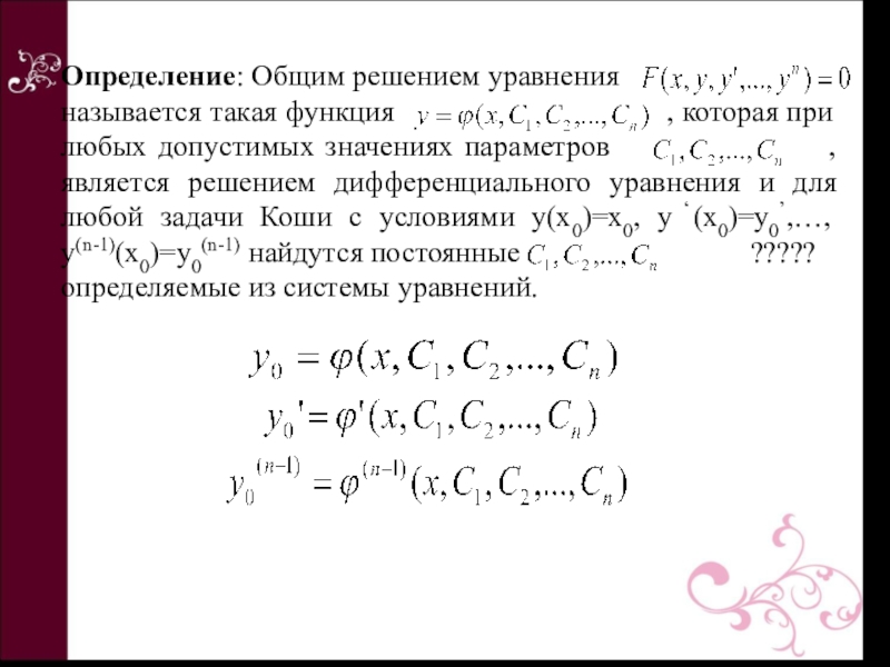 , которая при любых допустимых значениях параметров , является решением дифференциального уравнения и для любой задачи Коши с условиями y(x0)=x0, y ‘(x0)=y0’,…, y(n-1)(x0)=y0(n-1) найдутся постоянные ?????