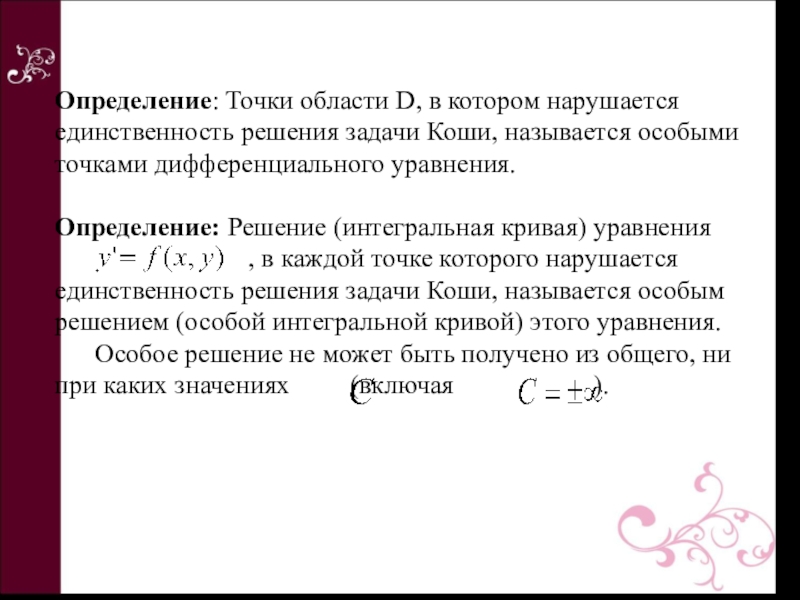 Слайд 30Определение: Точки области D, в котором нарушается единственность решения задачи Коши,