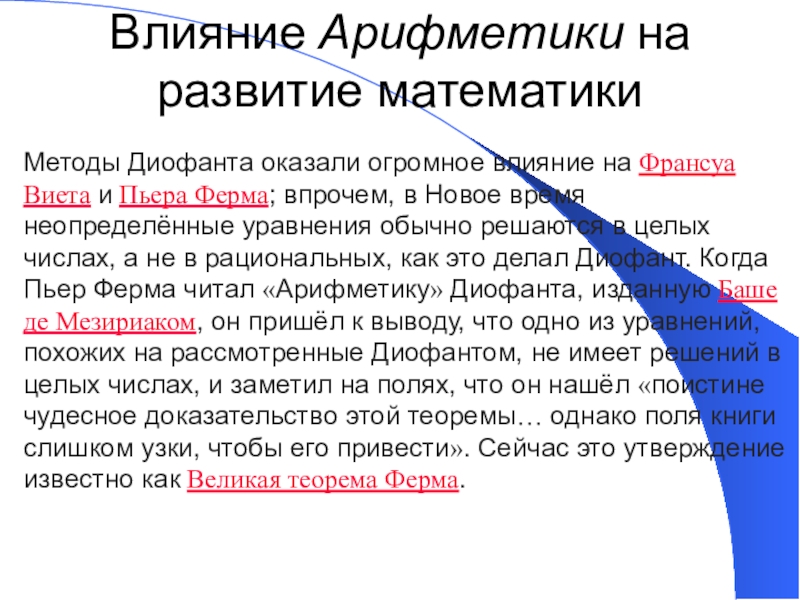 Влияние Арифметики на развитие математикиМетоды Диофанта оказали огромное влияние на Франсуа Виета и Пьера Ферма; впрочем, в Новое время неопределённые уравнения обычно