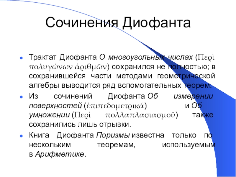 Сочинения Диофанта Трактат Диофанта О многоугольных числах (Περὶ πολυγώνων ἀριθμῶν) сохранился не полностью; в сохранившейся части методами геометрической алгебры