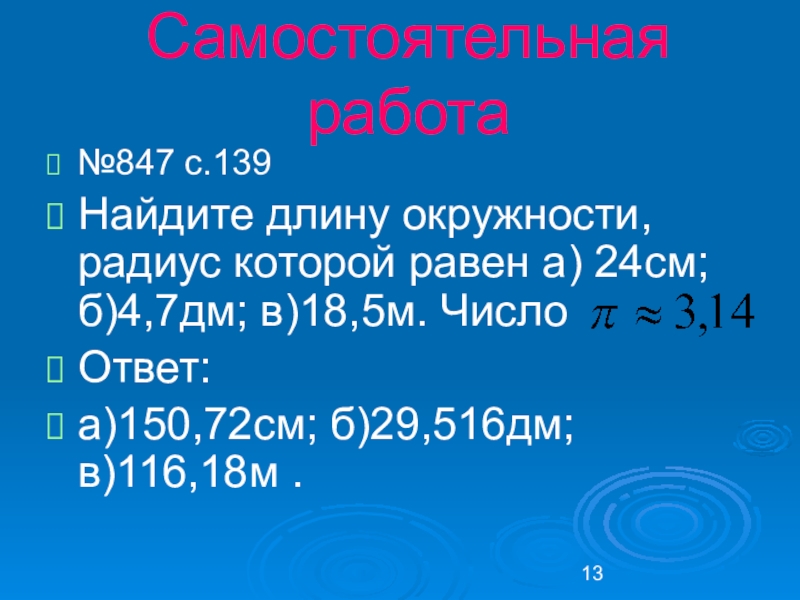 Найдите длину окружности, радиус которой равен а) 24см; б)4,7дм;