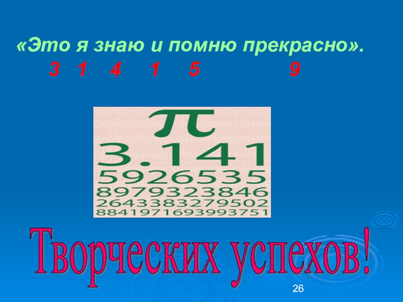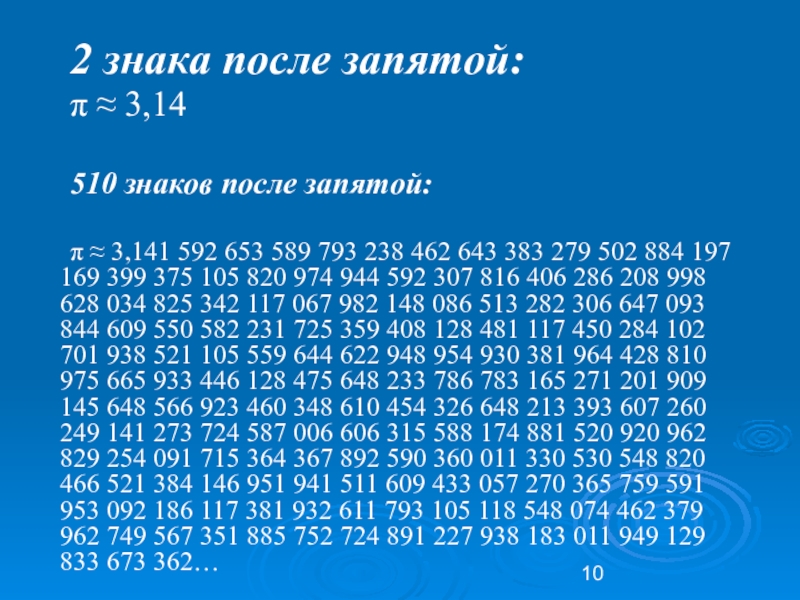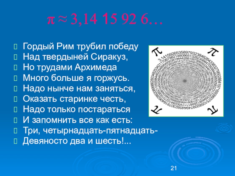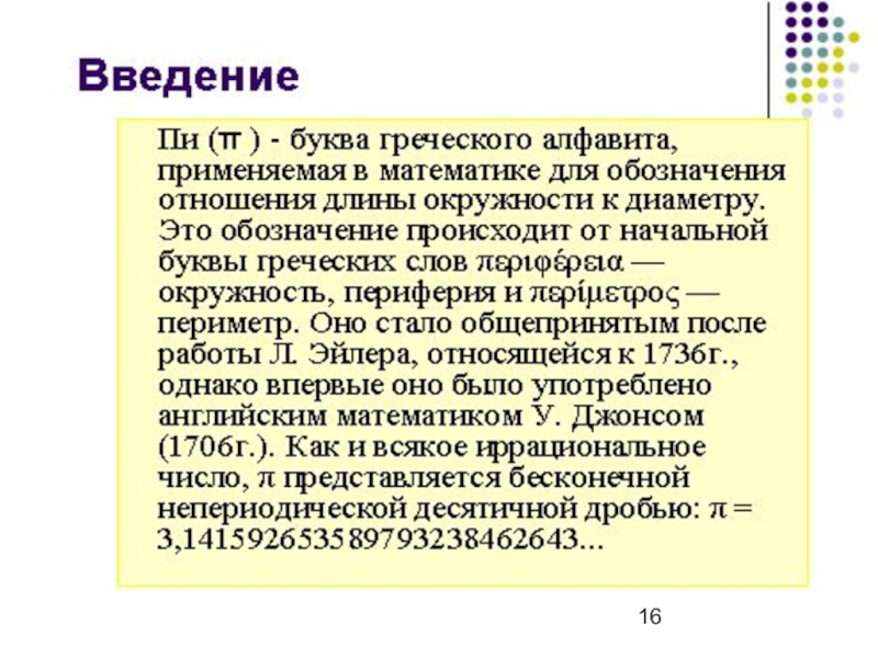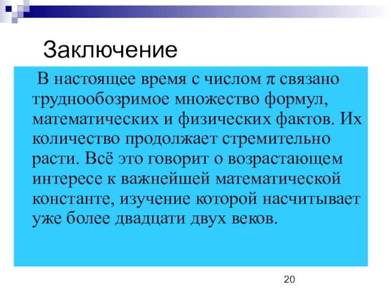 и физических фактов. Их количество продолжает стремительно расти. Всё это говорит о возрастающем интересе к важнейшей математической константе, изучение которой насчитывает уже более двадцати двух веков.