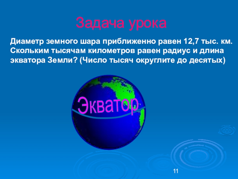 Слайд 11Диаметр земного шара приближенно равен 12,7 тыс. км. Скольким тысячам километров