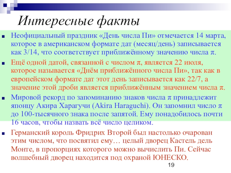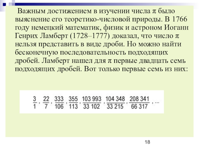 Слайд 18 Важным достижением в изучении числа π было выяснение его теоретико-числовой природы.