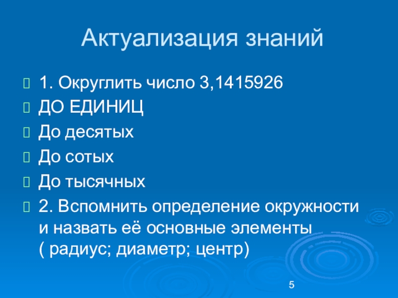 Вспомнить определение окружности и назвать её основные элементы ( радиус; диаметр; центр)