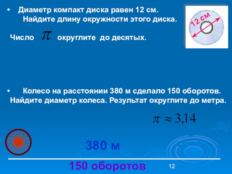Слайд 12 Диаметр компакт диска равен 12 см.