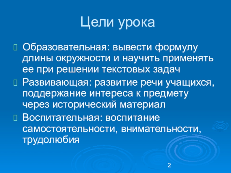 Образовательная: вывести формулу длины окружности и научить применять ее при